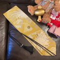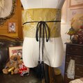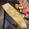 その一瞬を切り取ったような名古屋帯を、ウエストを彩るサッシュベルトへと再誕させました。こっくりとしたマスタードゴールドに、菊の白いシルエットが浮かび上がり、柔らかな日差しを映す織りの陰影が奥行きを添えます。真鍮色のハトメに通した漆黒の組紐は、束ねた瞬間に影を落とす蔦のようにラインを引き、二条のタッセルが腰もとで揺れて秋風の音を奏でる――クラシカルな帯の格を残しつつ、結び方ひとつでモードにもエレガントにも化ける、あなたの装いに“金色の余韻”を灯す一本です。
