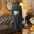 夜空を閉じ込めたようなブラックドットに、墨色グラデーションで百合が浮かぶサッシュベルトを合わせたワンピース。ドットが星屑のようにきらめき、名古屋帯から仕立てたベルトの艶めく花弁が奥行きを添えます。シルバーグレーの帯紐タッセルが歩みに合わせて揺れ、静かな闇に光を差すアクセントに。ベレーやレースアップブーツでモードに、ヒールとパールでクラシカルにも着回せる一着です。