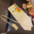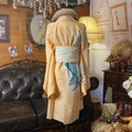 柔らかなアプリコットカラーに陽だまりを閉じ込めた付下げを、ドレスライクな一着へ。裾と袖に配した扇面文様は、孔雀青や翡翠色で描かれた流水と牡丹が重なり、歩くたび淡い光を受けて浮き立ちます。ウエストを締めるのは、アイボリー地のサッシュベルト。琳派の色彩を思わせる花鳥の刺繍に、クリームゴールドのタッセルコードを合わせ、クラシカルな華やぎを添えました。スニーカーで抜け感を出せばデイリーに、ヒールと帯留め風アクセで和モードへ。シーンも季節も軽やかに飛び越える、陽光色のリメイクワンピースです。