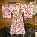 唐草のようにうねるワインレッドと朱の花弁。アール・ヌーヴォーを思わせる流線柄が躍る浴衣を、1 枚で着映えするワンピースへリメイク。付属のボルドーサッシュ帯はコルセット感覚で締めても、手持ちのベルトに替えても OK。麦わら帽&サンダルで夏フェスへ、ハイネック&ブーツで秋口まで。“レトロ×モダン”を季節横断で楽しめる一着です。