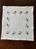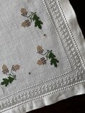 綿地に丁寧に刺繍糸で可愛いどんぐりのモチーフを刺繍して、またその周囲を白糸でトリミングを施した魅力ある作品。