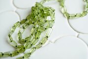 アリゾナ産・透明感あふれるグリーンカラーのペリドットをシルク糸で結びながらつなげて作ったラリエットです。石は長さが4~6mm前後(個体差があります)の角材のような形、細かい石たちですので、おつけいただくときらきらと光りを反射してとてもきれいです。