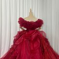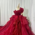 上品!カラードレス ボルドー色 オフショルダー キラキラスパンコール ラッフルフリル ボリュームドレス 花嫁