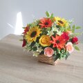 ひまわり、サニーカラーの花々と薔薇を花カゴに詰めて、明るく華やかな雰囲気に仕上げました。