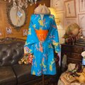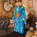 晴れやかなターコイズブルーに、ピンク・イエローのトンボと矢が駆け抜けるポップな浴衣リメイクワンピース。まるで夏祭りの夜空を切り取ったような、軽やかで元気な一枚です。