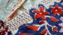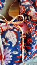表のブロックプリントの生地は、紺色の生地にピンクや赤のお花が夏のよるに咲くお花や、花火のように華やかにみえました。