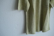 厚みは薄いニット生地ではなく、糸はたっぷり使った薄地と中厚地の間くらいとイメージいただくと実際に近いと思います。リネンで肌ばなれ良くさらっとした質感で、通気性もありますので夏に快適に着られます。薄いニット生地では出ない上品なきちっとした雰囲気が魅力のカットソーです。