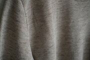 厚みは薄いニット生地ではなく、糸はたっぷり使った薄地と中厚地の間くらいとイメージいただくと実際に近いと思います。リネンで肌ばなれ良くさらっとした質感で、通気性もありますので夏に快適に着られます。薄いニット生地では出ない上品なきちっとした雰囲気が魅力のカットソーです。