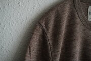 厚みは薄いニット生地ではなく、糸はたっぷり使った薄地と中厚地の間くらいとイメージいただくと実際に近いと思います。リネンで肌ばなれ良くさらっとした質感で、通気性もありますので夏に快適に着られます。薄いニット生地では出ない上品なきちっとした雰囲気が魅力のカットソーです。