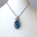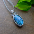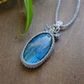 見る角度や光の加減によって、石全体に艶やかで鮮やかに煌めくブルーシラー(ラブラドレッセンス)が魅力的で美しいラブラドライトのマクラメ編みペンダントネックレスです。力強く輝く虹色のシラーが印象的なラブラドライトを丁寧に編み込み、胸元を華やかに彩る存在感のあるマクラメ編みペンダントに仕上げました。