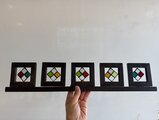 多色のダイヤモンド型模様が施された木製のステンドグラスフレーム。