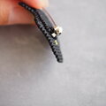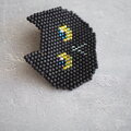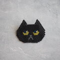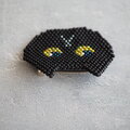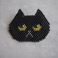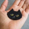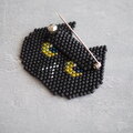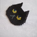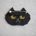 猫の顔は、マットな黒のビーズ、目は、同じ黒だとわからなくなってしまうので、少しブルーと猫の目らしい黄色を使いました。鼻と口の部分は黒系のシルバーの輝きのあるビーズを使っています。