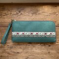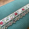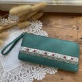 枝から下がるりんごと小さな蜂。繊細なデザインのリボンと、深みのあるグリーンのリネン生地を使用して、長財布を作りました。