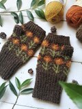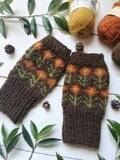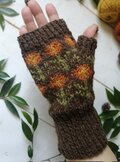 明るめの茶に琥珀色の花模様を編み込んだ、手編みのハンドウォーマーです。