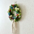 リースはグリーンをベースに、サルスベリのような鮮やかピンク紫陽花、爽やかなブルースター、白いアナベル、ラベンダー、薄ピンクの草花等を添えました。