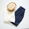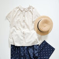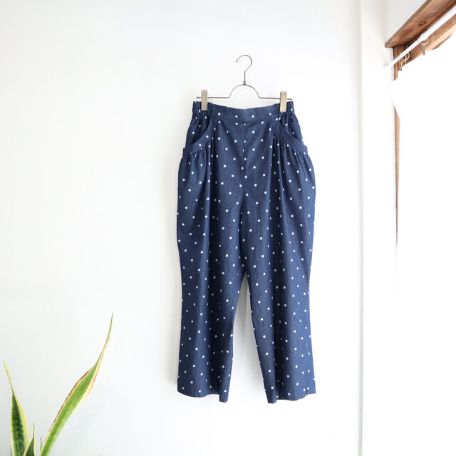 2way tuck & gather blouse (white/linen)ホワイトのブラウスであまり、特長が無いように見えるけれど、ボタンのつけかたに変化をもたせ、デザインに工夫されたところが、よかった。