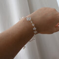 特大サイズを含む11粒のハーキマーダイヤモンド(※)を使ったリュクスな輝きが美しいブレスレット。両端にポイントのあるこの形はカットされていない原石そのままの形です。鏡のような鋭い透明感もあり、光にかざすととても美しく輝きます。ナチュラルで神秘的な石たちが手元に視線を集める素敵なブレスレットです。