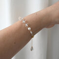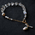 特大サイズを含む11粒のハーキマーダイヤモンド(※)を使ったリュクスな輝きが美しいブレスレット。両端にポイントのあるこの形はカットされていない原石そのままの形です。鏡のような鋭い透明感もあり、光にかざすととても美しく輝きます。両端にはレインボームーンストーンや淡水パールなどを合わせています。ナチュラルで神秘的な石たちが手元に視線を集める素敵なブレスレットです。