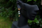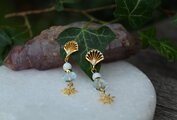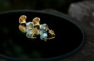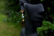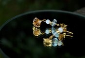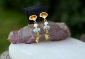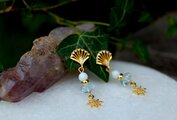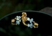 扇の形のスタッズパーツに、4ミリのマザーオブパールと8ミリのブルートパーズを組ませました。さらに、ゴールドのスターパーツをあしらってあります。