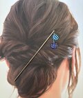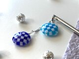 ブルーと水色の市松模様のおはじき型とんぼ玉でかんざしを制作しました。