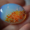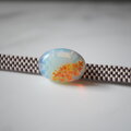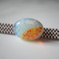 この帯留めは、虹色に輝く天然石オパールに、秋の花・金木犀を組み合わせたデザインです。