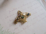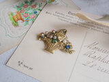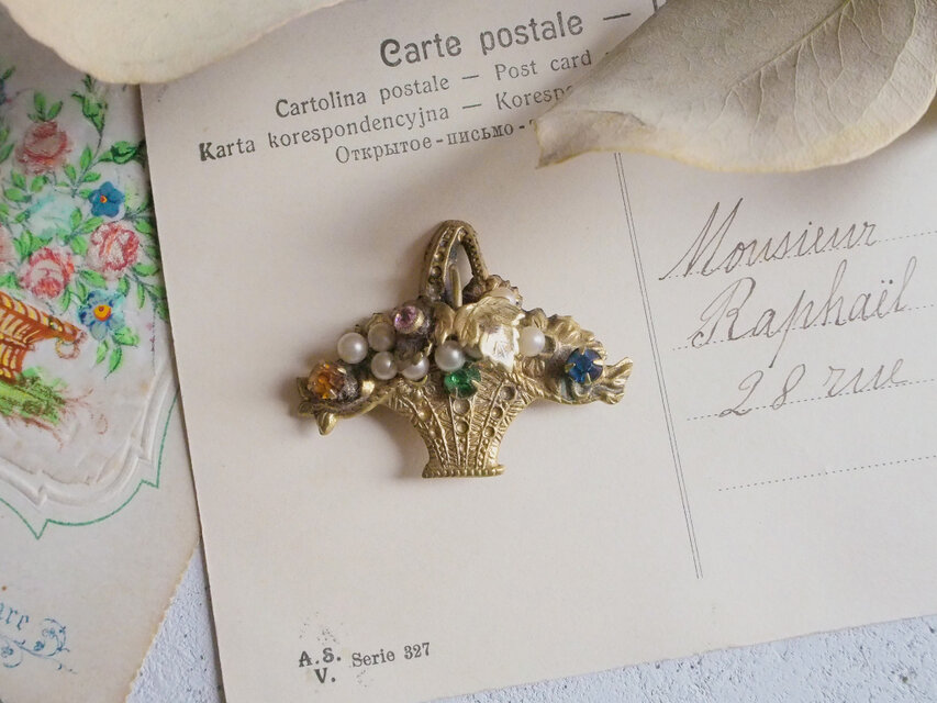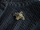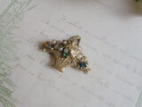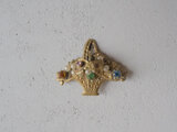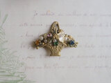 小さなガラスとパールが散りばめられた花かごのブローチです。