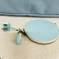 同じ水色のタンニンなめし牛革で作った丸ポーチつきです。小銭入れやキーケースがわりに。
