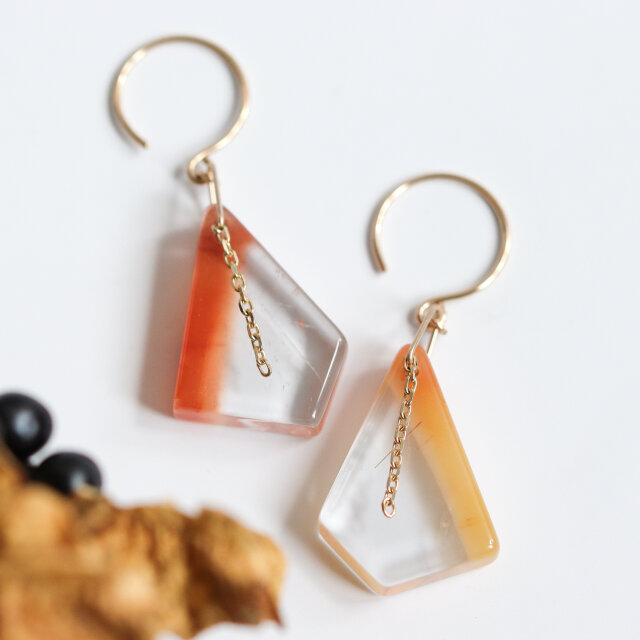 向こう側が見えるほど透き通った水晶に、南国の果実を思わせるテラコッタオレンジがふわりと浮かび、