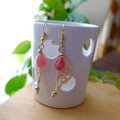 丸みのころころとした愛らしい印象のインカローズが引き立つように、明るめのコードで丁寧に編み込んで、耳元でゆらりと揺れる上品で印象的なマクラメピアスに仕上げました。