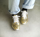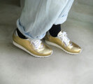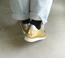 上品めなゴールドは、派手に見えて意外と肌馴染みよく、またソックスとの相性も◎。