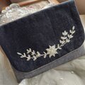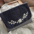 黒リネンのフラップに刺繍をして、中央にパールビーズを付けています。