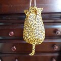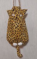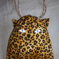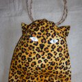 お座りしたジャガー猫型の巾着バッグです。