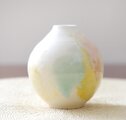 すっきりとした縦長フォルムの一輪挿しに成形後、ほんのり生成色のマット釉をかけ、春を思わせる色とりどりの釉薬で模様を施しました。