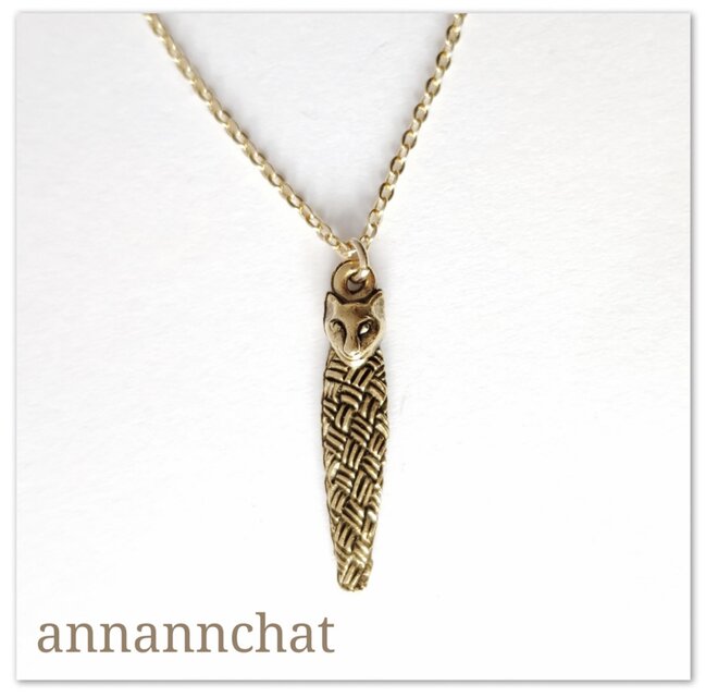 アメリカ製のピューター素材 猫のミイラのモチーフ(25mm)で ネックレスを作りました。アンティックゴールドカラーです。