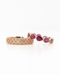 ローズカラーのペアシェイプカットルビーを、ぐるりと一周あしらったフルエタニティリングです。