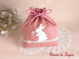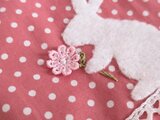 ピンクのドット柄生地に、白いうさぎとお花のアップリケを丁寧に縫いつけました。