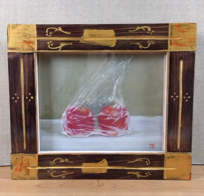 アクリル「ビニール袋の中の二つの林檎」