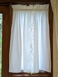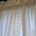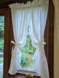 ♥️清潔感のある透けないホワイトコットン生地に、たっぷりギャザーを施したお花のチュールレースとサテンリボンをあしらった、両開きカフェカーテンを製作しました。