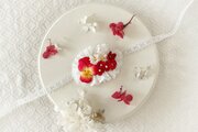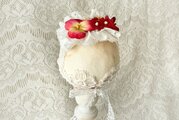 ホワイトのレースとコットンリネンをベースに、レッドのビオラや小花、オフホワイトの小花をのせたヘッドドレス。