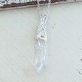 シルバーレースを纏ったクリアな煌めきは胸元を明るく照らし清涼感を演出します*レース金具下部付近に内包クラックが見られますが総じて優れた透明度*ブラジル産ホワイトアメジストは採掘時点で無色透明、一見クリアクォーツですが結晶形状はアメジストといったイメージです*実物のレースを銀に置換鋳造したキャップ部分はレース素材そのもののリアルな表情と美しさにマットな質感でナチュラルなアンティーク感をお楽しみ下さい*シンプルながら存在感があり幅広いファッションやシーンに合わせやすく汎用性が高いデザインです*925チェーン1.3㎜40㎝付き(長さのご希望がございましたら承ります)通常、黒化遅延処理を施しますが銀そのものの変化をお好みの場合は処理不要とお申し付けください*黒化防止ロジウムコーティング(最終画像下段色味参照)ご希望の場合はチェーンとともに承ります(別途1500円)
