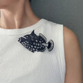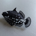 水深50mくらいのサンゴ礁などに生息するトロピカルフィッシュのモンガラカワハギをモチーフにブローチを製作しました。
