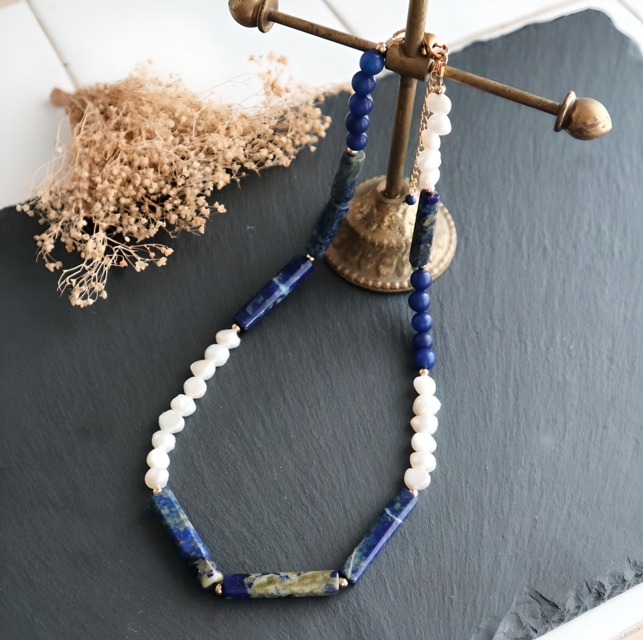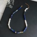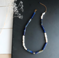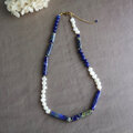 ●アフガニスタン産のチューブ型ラピスラズリとバロック型の淡水真珠をランダムに連ねました。