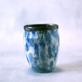 白土に白化粧泥を刷毛塗りした地に、藍色の呉須で雨の模様を描いたモダンアート柄の花瓶です。