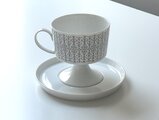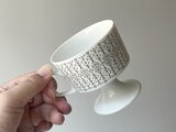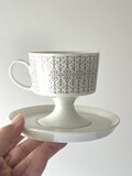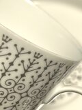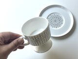 ヴィルカラらしいフォルムの美しいステムが取り付けられたシンプルな白地のカップ&ソーサーには、チャコールグレーでアラベスクを思わせる模様が施されています。