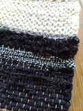 縦糸も生成りの麻糸です。裂き布を活かすために、粗めの密度にしたので刺し子のようにも見えます。