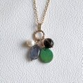 ターコイズの爽やかなブルーグリーン、アイオライトの神秘的な紫、スモーキークオーツの落ち着いたブラウン、そして淡水真珠の柔らかな輝き。