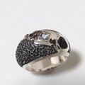 癖が強く、中央よりややズレた位置に留められたスクエアのアクアマリンに黒い光沢を放つ三葉虫の化石がお互いに主張しながら全体にマットで地味なテイストながらも微妙に目を引く存在感!