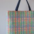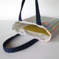 持ち手は紺色の無地にロープを入れ感触よく仕上げました。