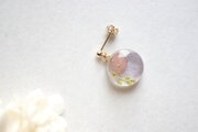 二色の紫陽花の花びらと葉っぱ、ブリオンを丸いレジンに沈めた、可憐で素朴なピアス。
