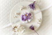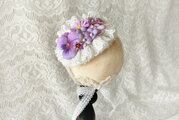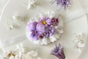 ホワイトのレースとコットンリネンをベースに、ライトパープルのビオラや小花をのせたヘッドドレス。
